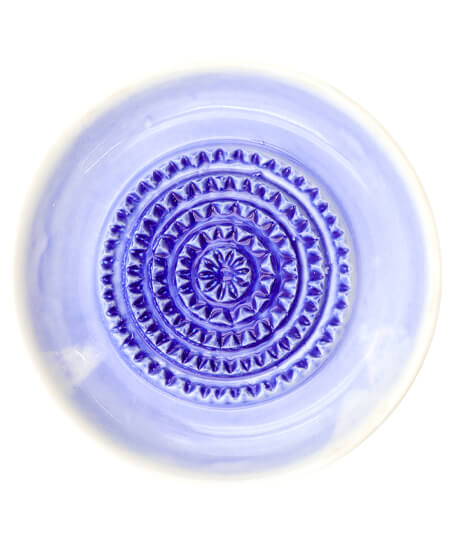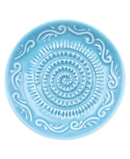 The deep cobalt background with vine and berry motifs offers a sense of refinement that makes this plate not just a tool but also a centerpiece for fine dining presentations. Upscale restaurants can use it as a functional dish for grinding and serving sauces directly at the table, enhancing the dining experience.